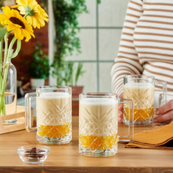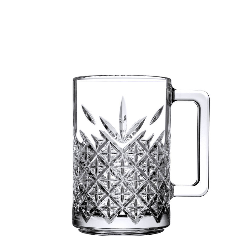 Sklenený hrnček. Sklo je vysokotvrdené, čo znamená že je odolnejšie voči nárazom a náhlym teplotným rozdielom. Hrnček je vhodný na horúce nápoje. V prípade rozbitia sa roztriešti na malé tupé kúsky. Hrnček je jednoducho stohovateľný. Timeless je moderná a zároveň nadčasová kolekcia so vzhľadom tradičného brúseného skla.