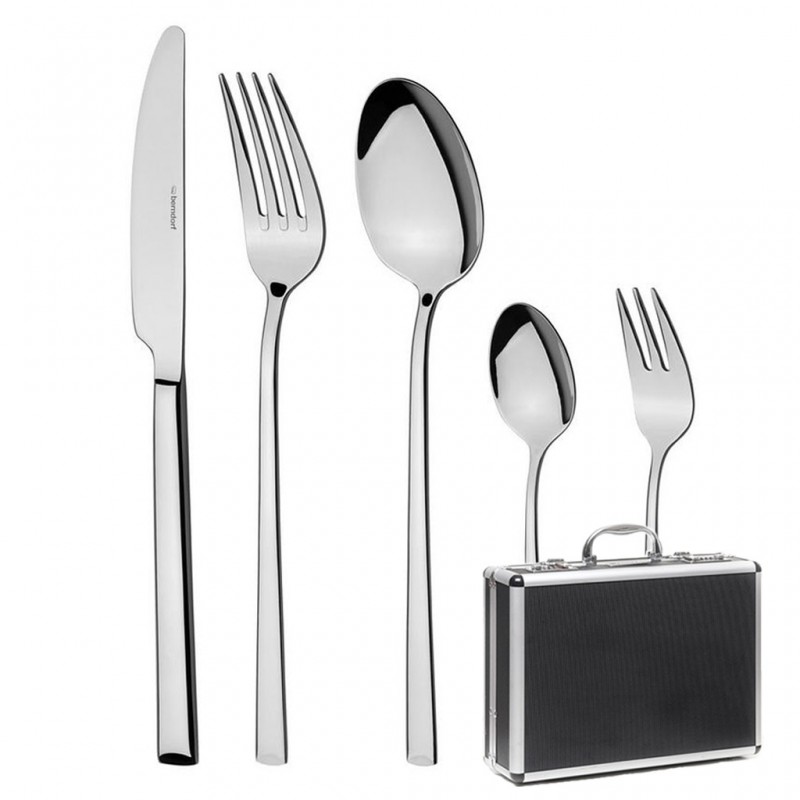 Súprava príborov z kvalitného lešteného chrómniklu balená v luxusnom kufríku. Zloženie: 12 x lyžica stolová, 12 x vidlička stolová, 12 x nôž stolový, 12 x lyžička na kávu/čaj, 12 x vidlička na múčnik